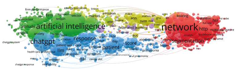 Se aprecia globalmente, como balance, que diferentes clústeres del mapa manifiestan una fuerte interconexión. Así, el clúster verde (inteligencia artificial) parece actuar como eje central, conectando directamente con el azul (IA y LLMs en salud), el amarillo (machine learning y BI), y el rojo, con investigaciones más novedosas sobre redes neuronales profundas y visión por computadora, evidenciando a la IA como un núcleo que une estas áreas aplicadas y técnicas.