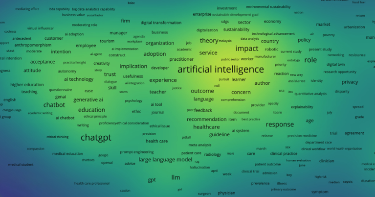 Este amplio clúster también pone énfasis en el impacto de la IA en la educación y el aprendizaje («education», «higher education», «student», «teacher», «academic writing» y «language learning»). La literatura explora cómo la IA afecta los procesos de enseñanza-aprendizaje y los desafíos éticos asociados, como el «plagiarism», la privacidad, consideraciones éticas y otras. También se documentan impactos en el ámbito de los negocios, la gestión y la transformación digital, donde la IA redefine el sector empresarial, en un sentido amplio. Lo atestiguan la relevancia de términos como «business», «digital transformation», «innovation», «sustainability», «job», «employment», «supply chain» o «customer», propios de una diversidad de sectores como la hostelería, el turismo o los servicios. Este clúster, aunque no es el único, se distingue por su énfasis en los LLM y la IA generativa, lo que se aprecia en el uso frecuente en la bibliografía de términos como «chatbot» y «ChatGPT», reflejando la experimentación en estos campos, lo que contrasta con publicaciones más tradicionales basadas en modelos predictivos. Se enfatiza igualmente en este conglomerado la investigación y metodología rigurosas, siendo comunes términos en esta área («empirical study», «qualitative study», «SEM», etc.), lo que subraya la importancia de la validación empírica y la construcción de teorías necesarias para comprender y gestionar eficazmente los impactos de la IA.