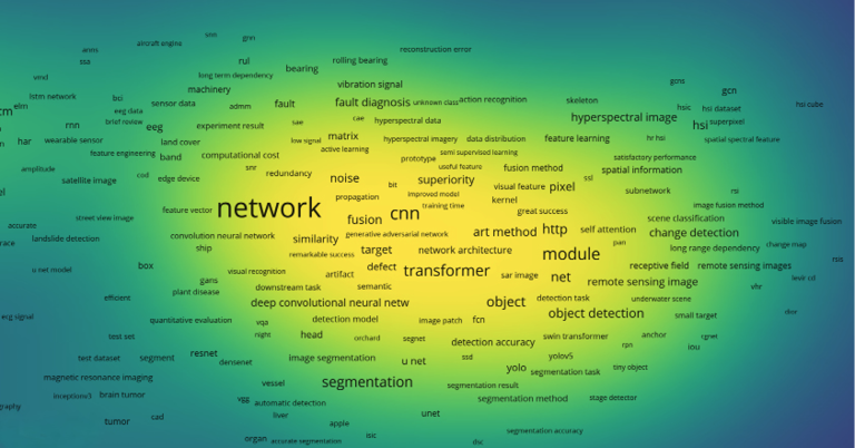 Las publicaciones de este clúster representan un epicentro en la investigación actual en inteligencia artificial, de gran interés en nuestro campo por el potencial, entre otros, del procesamiento y análisis de imágenes. El término «network» es el de mayor conectividad del clúster. Otros términos clave propios de estos campos y sobre los que gira la bibliografía (figura 4) son «module», «segmentation», «detection», «fault diagnosis», «target detection», «neural», «image fusion», «layer», «experimental result», «code», «github.com», «superiority». Son igualmente centrales términos relativos a algoritmos como «CNN», «LSTM» y «SVM».