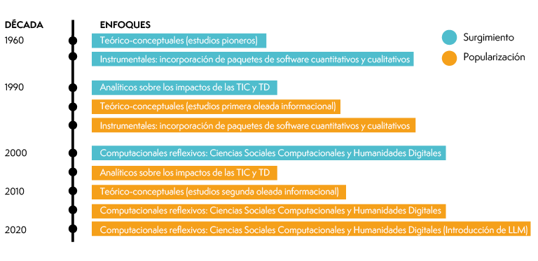 El presente artículo tiene como objetivo delinear un estado de situación respecto de los modos y formas en los cuales las ciencias sociales y las humanidades se han vinculado con las TD desde su aparición a inicios de la década de los setenta hasta la actualidad. Para ello, a partir de una exhaustiva revisión bibliográfica, que suma también algunos testimonios de informantes clave1, se despliega una categorización que permita clasificar el abanico de enfoques y corrientes del vínculo entre las ciencias sociales y las humanidades respecto de las TD, contemplando condiciones sociohistóricas de surgimiento, características, principales exponentes, foco del vínculo, diferencias y similitudes. Cabe destacar que estas relaciones son trabajadas desde una mirada sociohistórica, diferenciando entre posiciones centradas en cuestiones teórico-conceptuales y otras en el uso de paquetes de software, contemplando posturas mixtas. En este sentido, se proponen y abordan cuatro enfoques: centralmente teórico-conceptuales, estudios y análisis de impactos de las TD, movimientos instrumentales de incorporación de paquetes de software informáticos para técnicas metodológicas, enfoques computacionales reflexivos (ciencias sociales computacionales y las humanidades digitales).